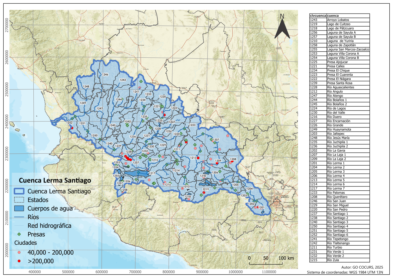 La Región Hidrológica Lerma-Santiago (RH 12) se localiza en el centro-occidente de México, abarcando una superficie aproximada de 121,300 km² . Se extiende a lo largo de varias entidades federativas, entre ellas el Estado de México, Michoacán, Querétaro, Guanajuato, Jalisco, Aguascalientes, Zacatecas y Nayarit. En el mapa se representa con un trazo azul que delimita su extensión geográfica, mostrando sus cuerpos de agua y ríos principales, la red hidrográfica (INEGI) y las subcuencas según la delimitación de la CONAGUA con sus claves numéricas. También se identifican las principales presas, tomado del Sistema Nacional de Información del Agua de la CONAGUA. Además, se indica la ubicación de las ciudades principales con más de 200,000 habitantes y las localidades de más de 40,000 habitantes, según el censo de población y vivienda 2020 del INEGI.