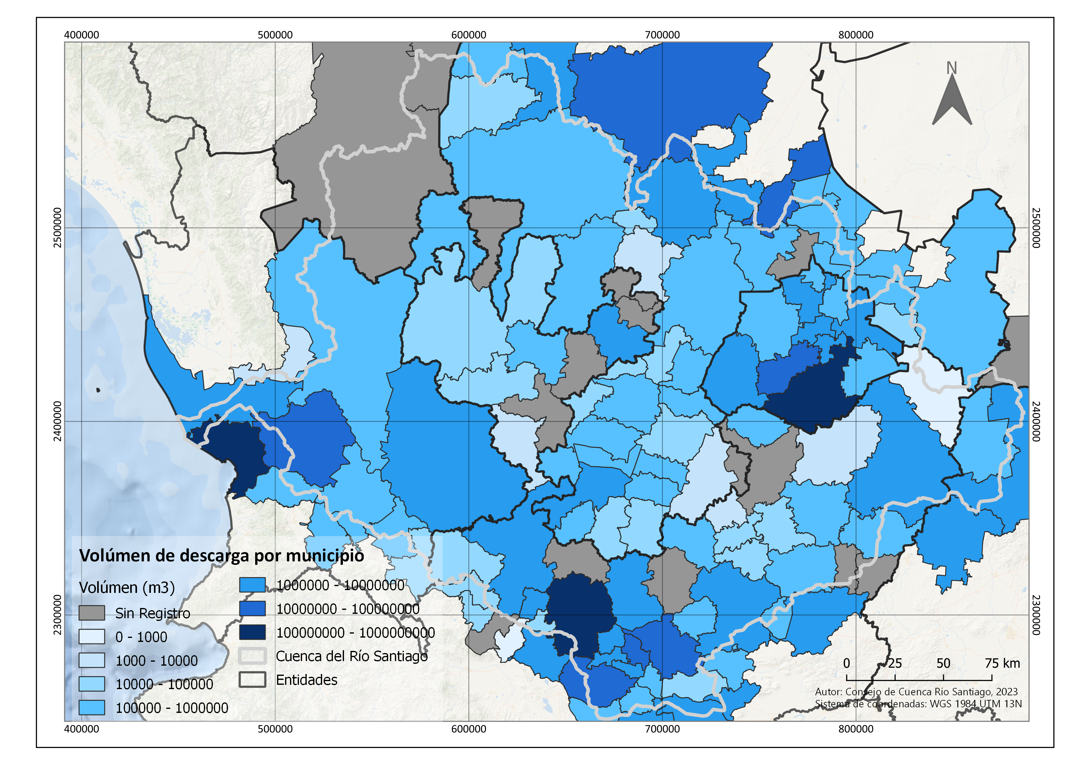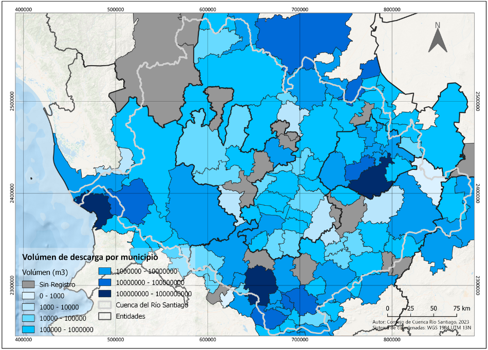 Para la descarga de aguas residuales en entornos naturales, como depósitos de agua, presas, cauces, zonas marinas, bienes nacionales u otras áreas, donde existe el riesgo de contaminar el subsuelo o los mantos acuíferos, es necesario obtener el permiso correspondiente por parte de la CONAGUA. Estos permisos de descarga forman parte del REPDA y de acuerdo con este último, los municipios de la cuenca que más volumen de descargas suman son Aguascalientes, Jésus María, Tepic, Tlajomulco de Zúñiga, Tonalá, Zapopan y Zapotlanejo. Por otra parte hay 16 municipios los cuales no cuentan con ningún registro de descargas (Figura 26).