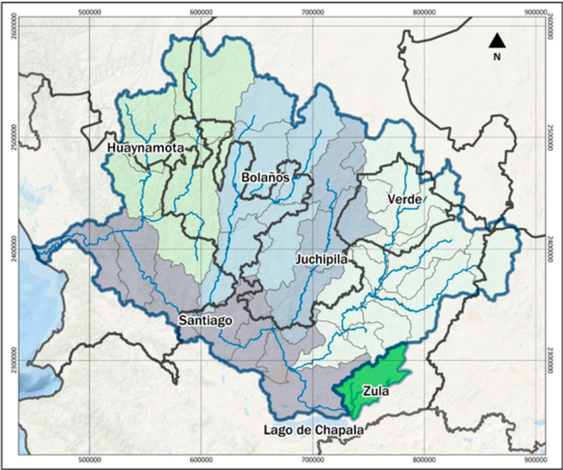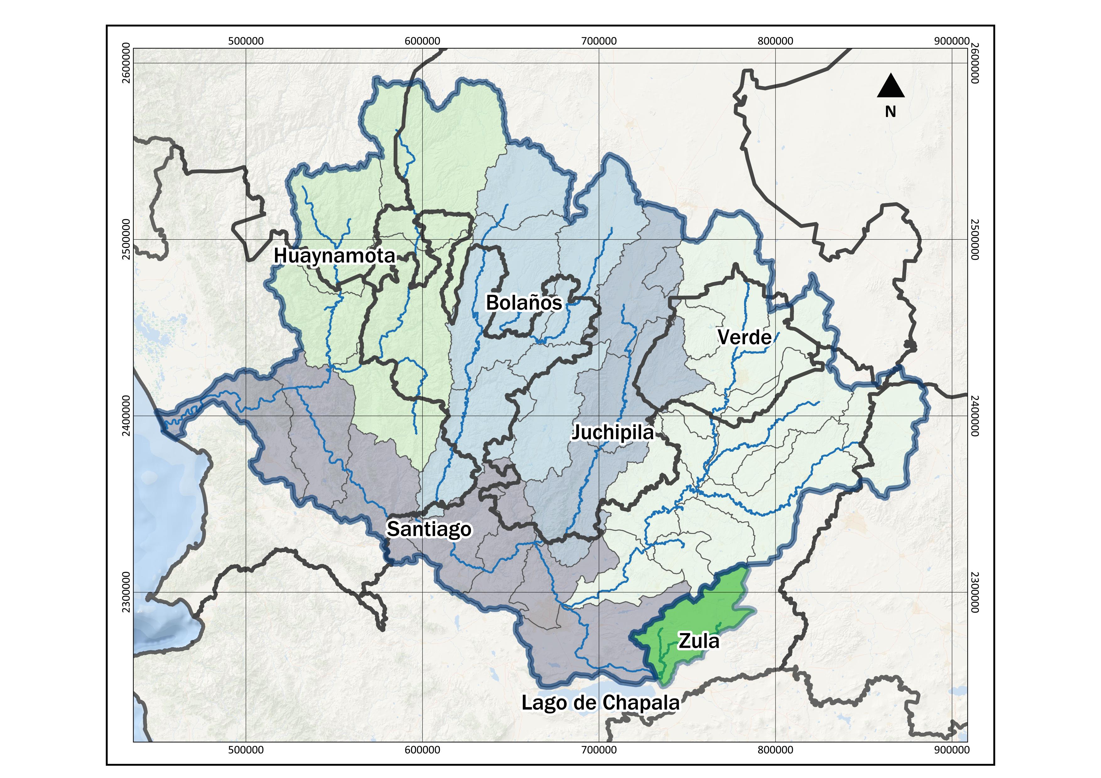 La corriente principal, el Río Santiago, nace en la ribera oriental del Lago de Chapala en el municipio de Ocotlán, Jalisco y desemboca en el océano pacífico en el estado de Nayarit, completando un recorrido de 562 km (CONAGUA, 2019). Sus principales tributarios son los ríos Verde, Juchipila, Bolaños y Huaynamota. Las 5 principales subcuencas de la subregión hidrológica del Río Santiago se muestran en la figura 7. Se considera también al Río Zula en Jalisco, que, aunque forma parte de la subregión hidrológica Lerma-Chapala, interactúa con el Río Santiago e influye directamente en la cantidad y calidad de sus aguas. Lo anterior sucede particularmente durante la temporada de estiaje, cuando se cierran las compuertas en la planta de bombeo de Ocotlán que impiden la descarga natural del Río Zula al lago de Chapala y se desvía el flujo hacia el cauce del Río Santiago; utilizando equipos de bombeo, con el objetivo de proveer de agua a la ciudad de Guadalajara y a módulos del Distrito de Riego 013. (SIAPA, 2010)